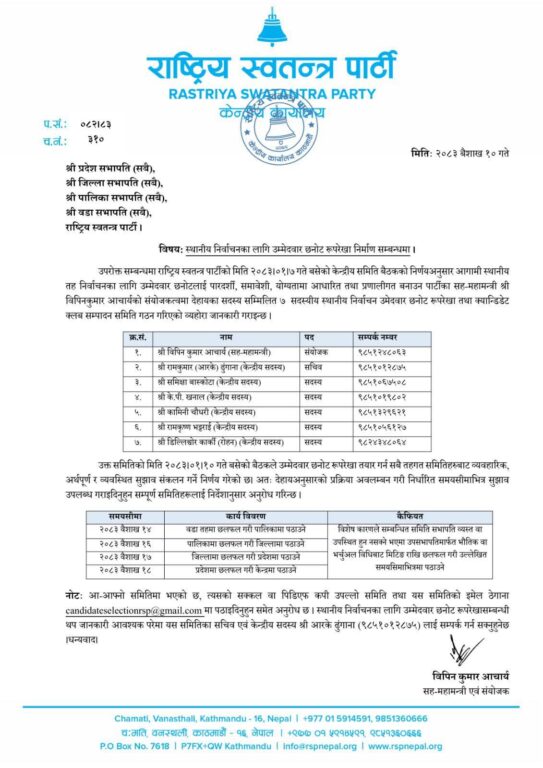 काठमाडौं- राष्ट्रिय स्वतन्त्र पार्टी (रास्वपा) ले आगामी स्थानीय तह निर्वाचनका लागि उम्मेदवार छनोट प्रक्रियालाई पारदर्शी, समावेशी र प्रणालीगत बनाउन सात सदस्यीय समिति गठन गरेको छ । पार्टीको केन्द्रीय कार्यालयका अनुसार सहमहामन्त्री विपिनकुमार आचार्यको संयोजकत्वमा ‘स्थानीय निर्वाचन उम्मेदवार छनोट रूपरेखा तथा क्यान्डिडेट क्लब सम्पादन समिति’ गठन गरिएको हो ।