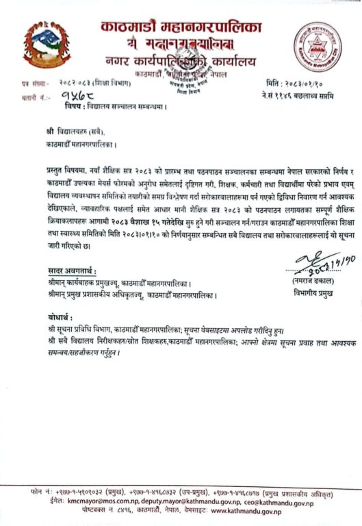 काठमाडौं – काठमाडौं महानगरपालिकाले नयाँ शैक्षिक सत्र २०८३ अन्तर्गत विद्यालय सञ्चालन सम्बन्धी सूचना जारी गरेको छ। महानगरको शिक्षा तथा स्वास्थ्य समितिको बिहीबारकाे निर्णयअनुसार काठमाडौँ भित्रका सबै विद्यालयमा पठनपाठन तथा शैक्षिक गतिविधि आगामी वैशाख १५ गतेदेखि सुरु गरिने भएको हो ।