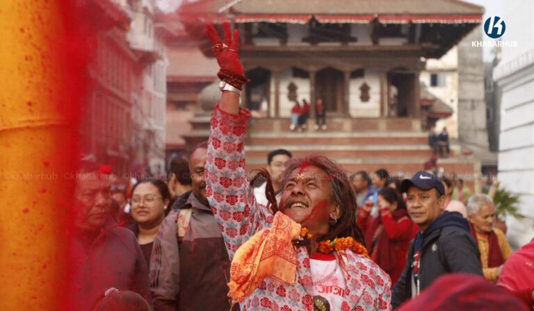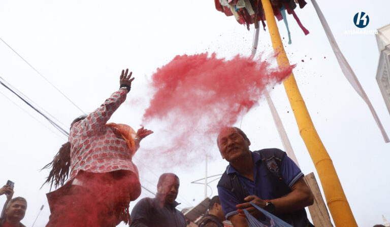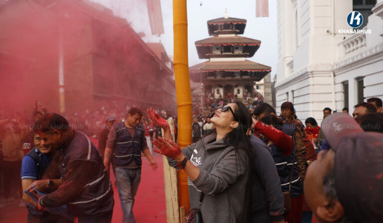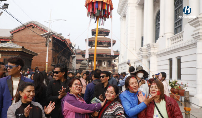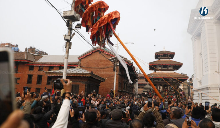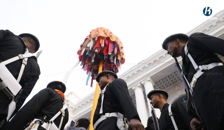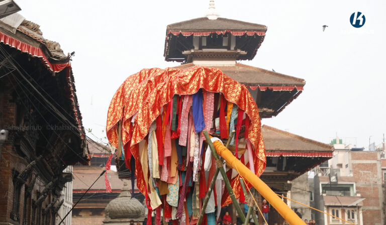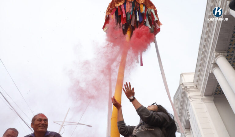 काठमाडौं– काठमाडौंको बसन्तपुरमा होलीको चीर ठड्याइएको छ । मङ्गलबार बिहान रङ्गीविरङ्गी कपडाहरूको ध्वजापताकासहितको तीन खण्डे चीर ठड्याइएको हो ।