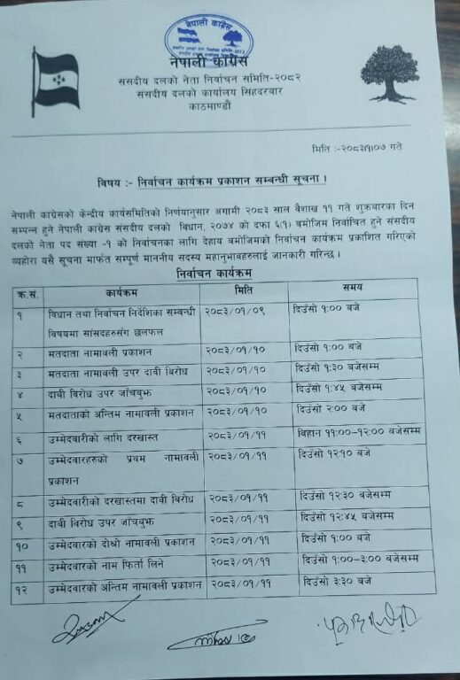 काठमाडौँ– नेपाली कांग्रेसले संसदीय दलको नेता चयनका लागि शुक्रबार निर्वाचन प्रक्रिया अघि बढाउँदै छ। पार्टीले सार्वजनिक गरेको निर्वाचन कार्यतालिका अनुसार उम्मेदवारी दर्ता बिहान ११ देखि १२ बजेसम्म हुनेछ भने मतदान साँझ ५ बजेसम्म सम्पन्न गरिने छ ।