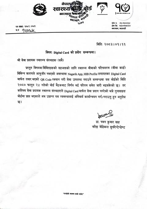 तर केही स्वास्थ्य संस्थाहरूले डिजिटल कार्डमार्फत सेवा नदिएको गुनासो आएपछि बोर्डले उक्त व्यवस्था कडाइका साथ कार्यान्वयन गर्न पुनः निर्देशन दिएको हो । अब सबै सेवा प्रदायक संस्थाहरूले डिजिटल कार्डलाई अनिवार्य रूपमा स्वीकार गरी बीमितलाई सेवा दिनुपर्ने बोर्डले स्पष्ट पारेको छ ।