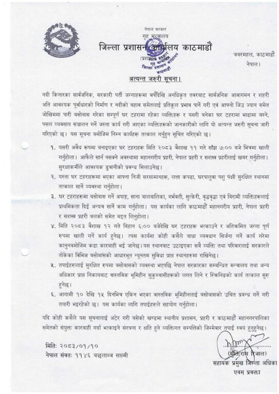 जिल्ला प्रशासनले वर्षौँदेखि सार्वजनिक आवागमन, शहरी पूर्वाधार निर्माण र नदीको बहावमा अवरोध पुऱ्याउँदै आएका यस्ता संरचनाहरू वैशाख ११ गते साँझ ७ बजेभित्र खाली गरिसक्न प्रशासनले अन्तिम निर्देशन दिएको हो । नदी किनारमा जोखिमपूर्ण रूपमा बसोबास गरिरहेका व्यक्तिहरूका साथै त्यहाँ भाडामा बस्ने र व्यवसाय गर्नेहरूलाई समेत लक्षित गरी यो सूचना जारी गरिएको छ ।