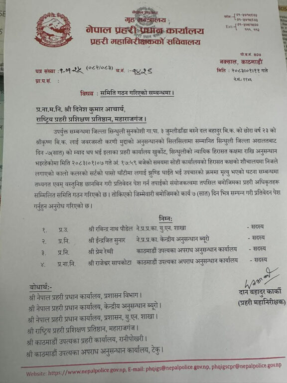 सिन्धुली प्रहरीको हिरासतमा युवाको मृत्यु प्रकरण छानबिन गर्न डीआईजी नेतृत्वको समिति