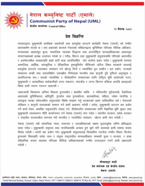 सुकुम्वासीको पक्षमा एमाले, बस्ती हटाउने नाममा बल प्रयोग नगर्न सरकारलाई चेतावनी