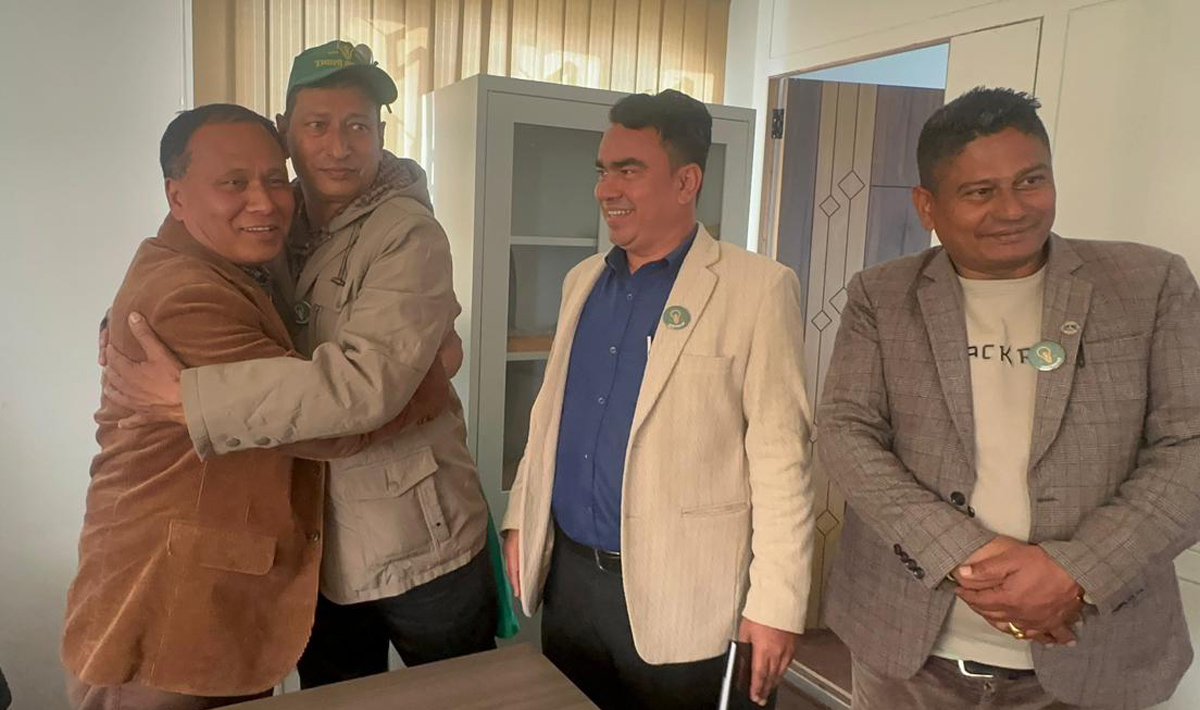 पार्टी अध्यक्ष तथा पूर्वमन्त्री कुलमान घिसिङले अधिकारीलाई पार्टीको ब्याच र टोपी लगाइदिँदै औपचारिक रूपमा पार्टीमा स्वागत गरेका छन्।