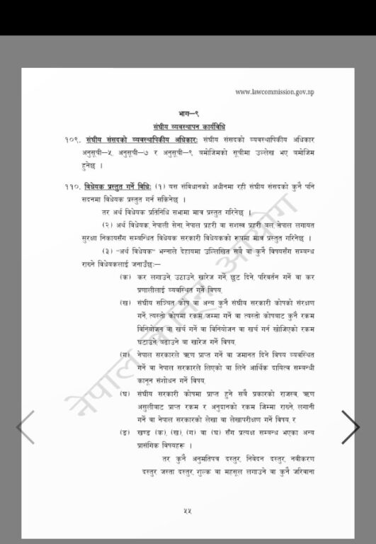 विशेषगरी वित्तीय विधेयक भने प्रतिनिधि सभामै पेश गर्नुपर्ने संवैधानिक व्यवस्था छ । यसले जनप्रतिनिधिको माध्यमबाट जनताका हितअनुकूल कानुन निर्माण सुनिश्चित गर्छ ।