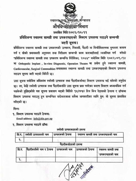 औषधि व्यवस्था विभागका अनुसार अधिकांश स्वदेशी उत्पादक तथा पैठारीकर्ताबाट विवरण प्राप्त भइसकेको भए पनि केही विदेशी उत्पादक तथा पैठारीकर्ताले विवरण नपठाउँदा अभिलेख अद्यावधिक हुन नसकेको बताउँदै सूचना प्रकाशन भएको मितिले १५ दिनभित्र सम्बन्धित सबै उत्पादक तथा पैठारीकर्ताले आफ्नो नाम, ठेगाना र स्वास्थ्य सामग्री तथा उपकरणको विवरण उपलब्ध गराउनुपर्ने विभागले जनाएको छ ।