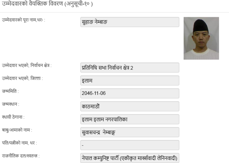 इलाममा पहिलो संविधानसभा सदस्य सुवासचन्द्र नेम्वाङ पुत्र तथा निर्वतमान सासंद सुहाङ दोस्रो पटक प्रत्यक्ष प्रतिस्पर्धामा होमिएका छन् । इलाम मात्रै नभएर अन्य ठाउँका मतदातालाई पनि उनको पूरा वैयक्तिक विवरण जान्ने कौतुहलता होला । तर इलाममा झन उनीसहित कुनै उम्मेदवारको शैक्षिक योग्यता र अनुभवलाई प्राथमिकता दिइएको छैन ।