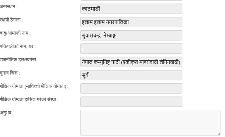 यस्तै पूर्वप्रधानमन्त्री तथा नेपाली कम्युनिस्ट पार्टीका अध्यक्ष एवम् रुकुमपूर्वका उम्मेदवार पुष्पकमल दाहाल प्रचण्डले पनि अध्ययनसहित पूरा विवरण उल्लेख गरेका छन् । आयोगको विवरणमा नयाँदेखि पुराना दलका सबै उम्मेदवारको अधिकांश परिचयात्मक विवरण अपूरो देखिन्छ ।