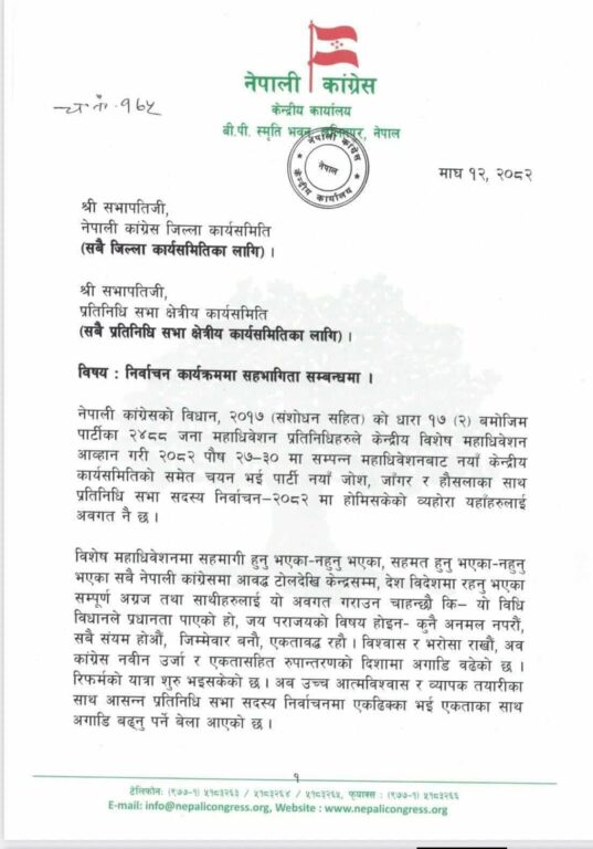 परिपत्रमा कांग्रेस विधानअनुसार पुस २७–३० मा सम्पन्न विशेष महाधिवेशनबाट नयाँ केन्द्रीय कार्यसमिति चयन भएसँगै पार्टीले नयाँ जोश, जाँगर र आत्मविश्वासका साथ निर्वाचनमा होमिनुपर्ने उल्लेख गरिएको छ । परिपत्रमा प्रतिनिधिसभा सदस्य निर्वाचनमा कांग्रेसको जित सुनिश्चित गर्न सबै तहका संगठन सक्रिय हुन आग्रह गरिएको छ ।
