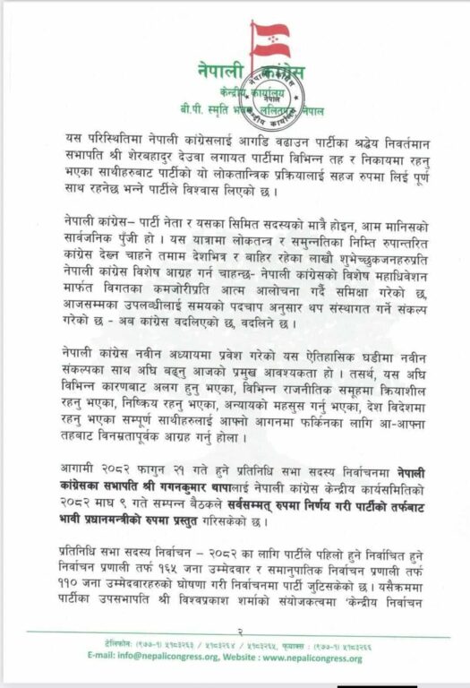 केन्द्रीय कार्यसमितिको २०८२ माघ ९ गते सम्पन्न बैठकले कांग्रेस सभापति गगनकुमार थापालाई पार्टीको तर्फबाट भावी प्रधानमन्त्रीका रूपमा प्रस्तुत गर्ने निर्णय गरेको जानकारी पनि परिपत्रमा समावेश छ ।