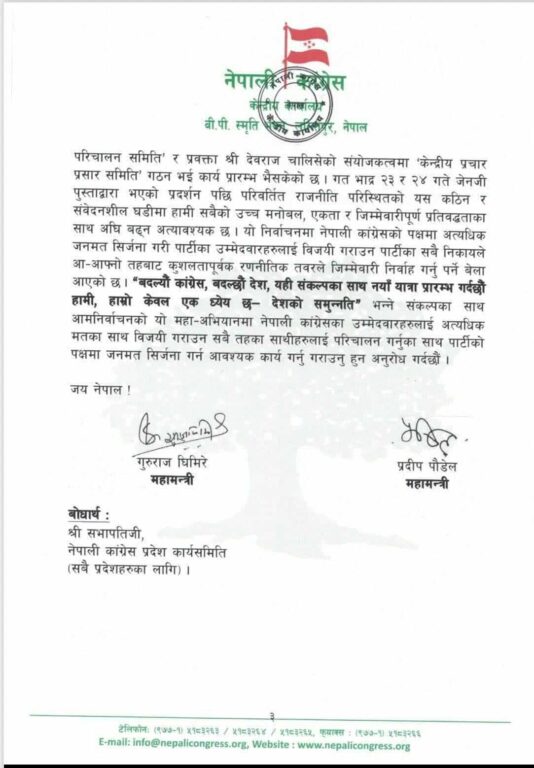 चुनावी अभियान प्रभावकारी बनाउन ‘केन्द्रीय प्रचार–प्रसार समिति’ गठन भई कार्य प्रारम्भ भइसकेको जनाउँदै पार्टीले सबै तहका निकायलाई अनुशासित, जिम्मेवार र समन्वयात्मक रूपमा परिचालित हुन निर्देशन दिएको छ । “बद्लिँदो कांग्रेस, बद्लिँदो देश, यही संकल्पका साथ नयाँ यात्रा” भन्ने नाराका साथ कांग्रेसले देशभर व्यापक जनमत सिर्जना गर्न आग्रह गरेको छ ।