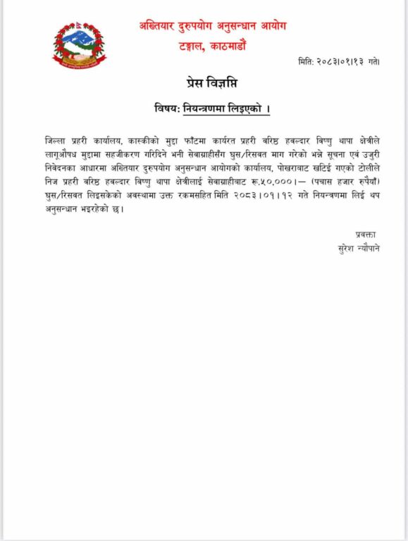 पोखरा – अख्तियार दुरुपयोग अनुसन्धान आयोगले जिल्ला प्रहरी कार्यालय कास्कीमा कार्यरत प्रहरी वरिष्ठ हवल्दार विष्णु थापा क्षेत्रीलाई ५० हजार रुपैयाँ घुससहित नियन्त्रणमा लिएको छ।