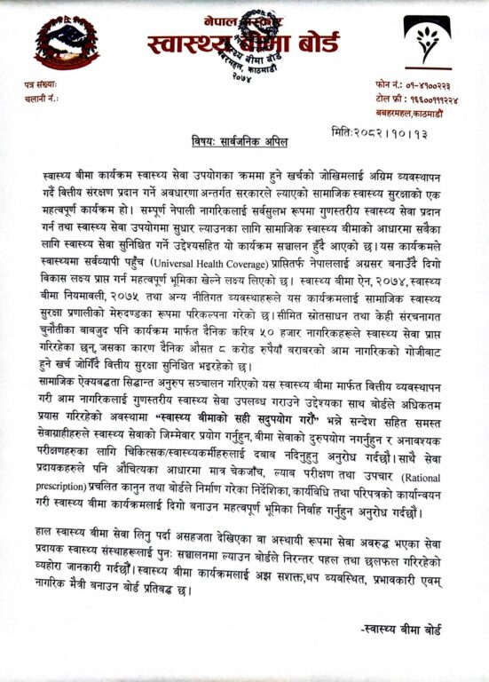 बोर्डले एक सार्वजनिक अपिल जारी गर्दै बीमा सेवाको दुरुपयोग नगर्न, अनावश्यक परीक्षण तथा उपचारमा दबाब नदिन र प्रचलित कानुन तथा निर्देशिकाअनुसार सेवा प्रवाह गर्न अनुरोध गरेको हो ।