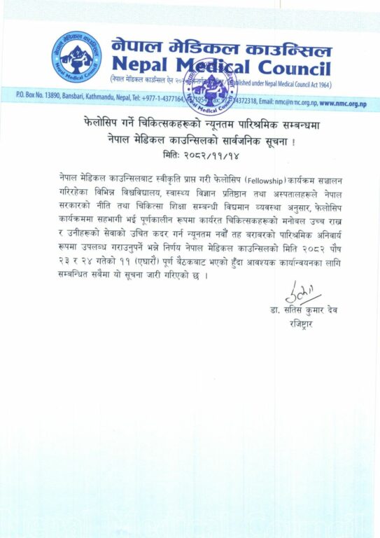 काउन्सिलका रजिस्ट्रार डा. सन्तोष कुमार देवद्वारा जारी गरेको सूचना अनुसार विभिन्न विश्वविद्यालय, स्वास्थ्य विज्ञान प्रतिष्ठान तथा अस्पतालहरूले सञ्चालन गरिरहेका फेलोसिप कार्यक्रममा संलग्न चिकित्सकहरूको मनोबल उच्च राख्न र उनीहरूको सेवाको उचित मूल्यांकन सुनिश्चित गर्न न्यूनतम नवौँ तह सरहको पारिश्रमिक उपलब्ध गराउनुपर्ने निर्णय गरिएको हो ।