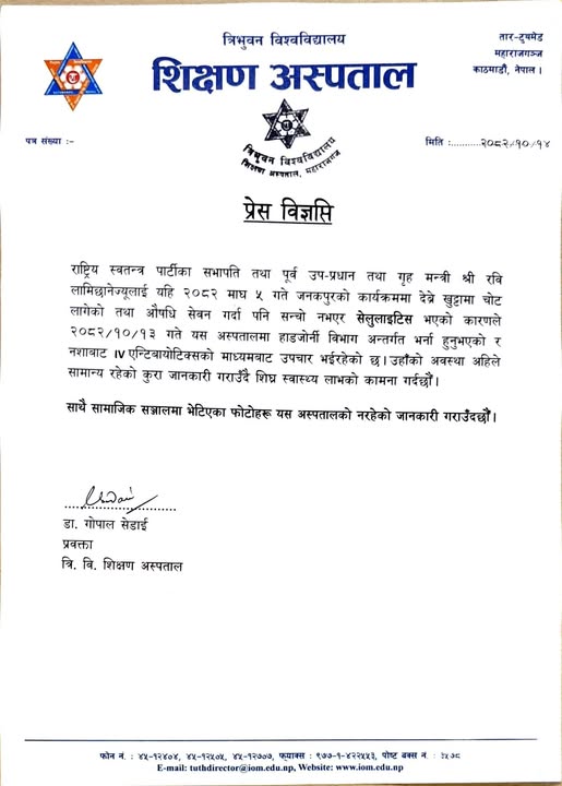 काठमाडौं- राष्ट्रिय स्वतन्त्र पार्टी (रास्वपा) का सभापति रवि लामिछानेको उपचारको विषयमा महाराजगन्जस्थित त्रिभुवन विश्वविद्यालय शिक्षण अस्पताल (टिचिङ) ले जानकारी गराएको छ ।
