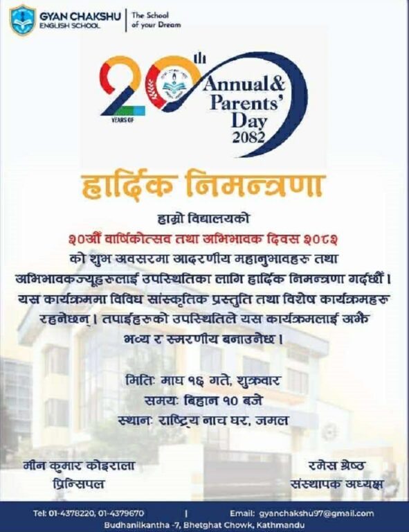 काठमाडौं– ज्ञान चक्षु इङ्ग्लिस स्कुलले २०औँ वार्षिकोत्सव तथा अभिभावक दिवस कार्यक्रम आयोजना गर्ने भएको छ।