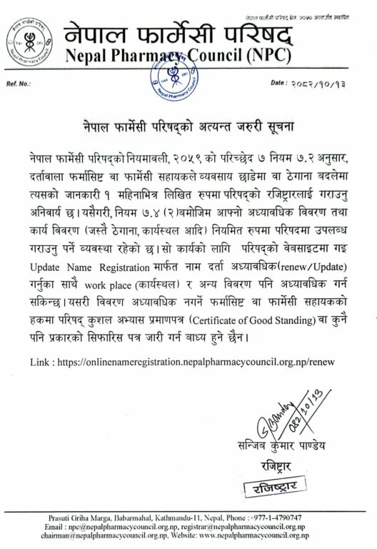 काठमाडौं– नेपाल फार्मेसी परिषद् (एनपीसी) ले दर्तावाला फार्मासिस्ट तथा फार्मेसी सहायकलाई आफ्नो नाम, कार्यस्थल र अन्य विवरण अनिवार्य रूपमा अद्यावधिक गर्न निर्देशन दिएको छ ।