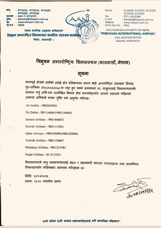 त्रिभुवन अन्तर्राष्ट्रिय विमानस्थल नागरिक उड्डयन कार्यालयले आज सूचना जारी गर्दै उक्त क्षेत्रतर्फ हुने केही उडान ढिलाइ, पुनःतालिका (रिस्केड्युलिङ) वा रद्द हुन सक्ने जनाएको छ।