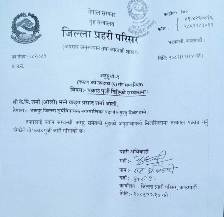 पक्राउ पर्नुअघि ओलीलाई ज्यानसम्बन्धी कसुरमा अनुसन्धानका लागि पक्राउ पुर्जी थमाइएको थियो ।
