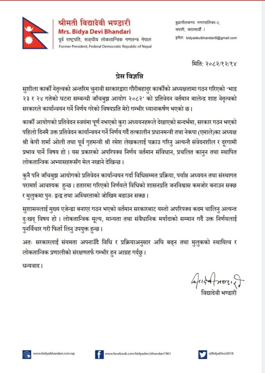 शनिबार जारी प्रेस विज्ञप्तिमा पूर्वराष्ट्रपति भण्डारीले सुशीला कार्की नेतृत्वको अन्तरिम चुनावी सरकारले गौरीबहादुर कार्की अध्यक्षतामा गठन गरेको भदौ २३ र २४ को घटनासम्बन्धी जाँचबुझ आयोगको प्रतिवेदन कार्यान्वयन गर्ने वर्तमान बालेन्द्र शाह नेतृत्वको सरकारको निर्णय संवेदनशील र दूरगामी प्रभाव पार्ने विषय भएको उल्लेख गरेकी छन्।
