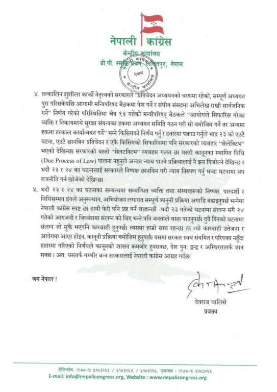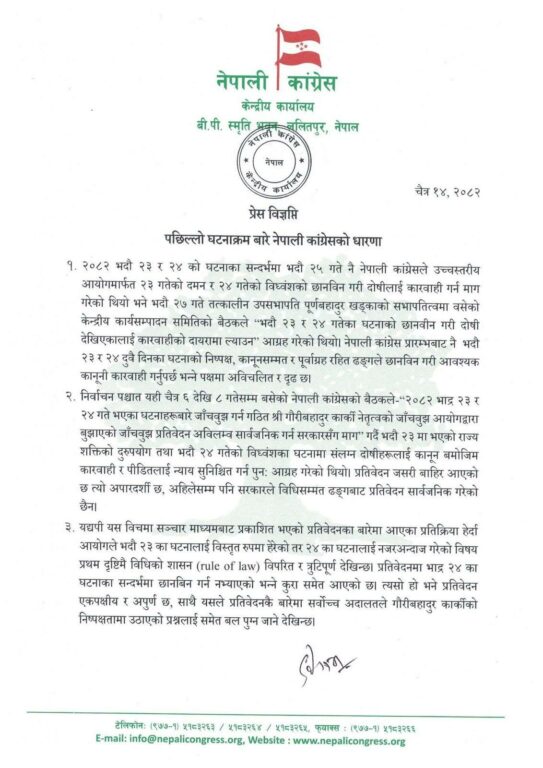 काठमाडौं– नेपाली कांग्रेस ले २०८२ भदौ २३ र २४ का घटनासम्बन्धी गौरीबहादुर कार्की नेतृत्वको जाँचबुझ आयोगको प्रतिवेदन कार्यान्वयन गर्ने सरकारको निर्णयप्रति असन्तुष्टि जनाएको छ । उसले निष्पक्ष, पारदर्शी र विधिसम्मत प्रक्रिया अपनाउन पनि सरकारलाई आग्रह गरेको छ।