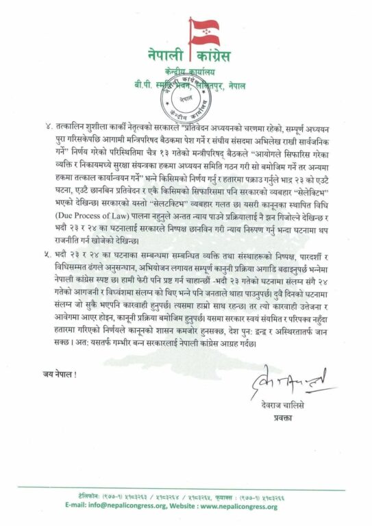 तत्कालीन प्रधानमन्त्री तथा एमाले अध्यक्ष केपी शर्मा ओली र तत्कालीन गृहमन्त्री तथा कांग्रेस नेता रमेश लेखक पक्राउ परेका विषय, साथै गौरीबहादुर कार्की आयोगको प्रतिवेदन कार्यान्वयनबारे कांग्रेसले दुई फरक धारका विज्ञप्ति सार्वजनिक गरेको छ ।