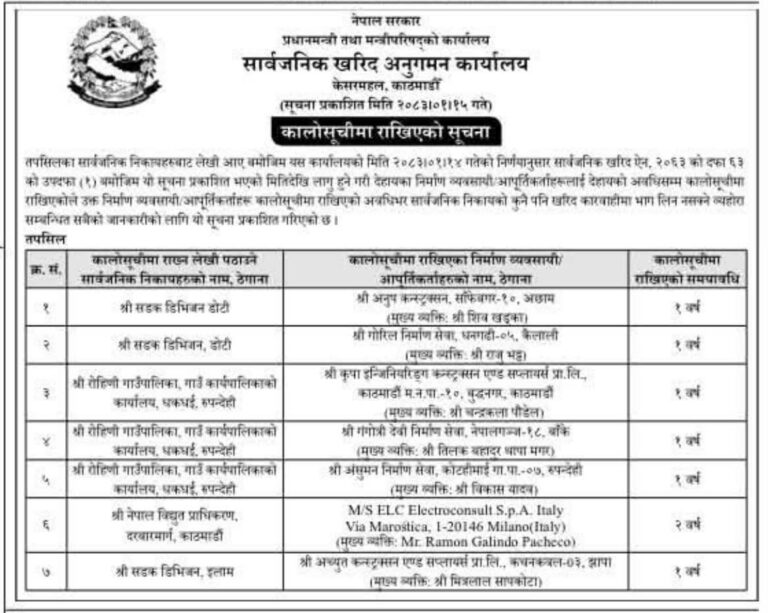 कार्यालयले अनुप कन्स्ट्रक्सन, गोरिल निर्माण सेवा, कृपा इन्जिनियरिङ्ग, गंगोत्री देवी निर्माण सेवा, अंसुमन निर्माण सेवा र अच्युत कन्स्ट्रक्सनलाई कालोसूचीमा राखेको छ । यी कम्पनीलाई एक वर्षसम्मका लागि कालोसूचीमा राखिएको उल्लेख गरिएको छ ।