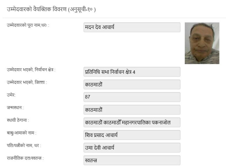यस्तै, ८७ वर्षीय मदनदेव आचार्य काठमाडौं क्षेत्र नं ४ बाट उम्मेदवार छन्। पूर्वप्रशासकसमेत रहेका आचार्यको ‘खिचडी’ नामक पुस्तक प्रकाशित छ। देशका लागि अझै केही गर्न सकिन्छ भन्ने विश्वासका साथ आफू चुनावी मैदानमा उत्रिएको आचार्य बताउँछन्।