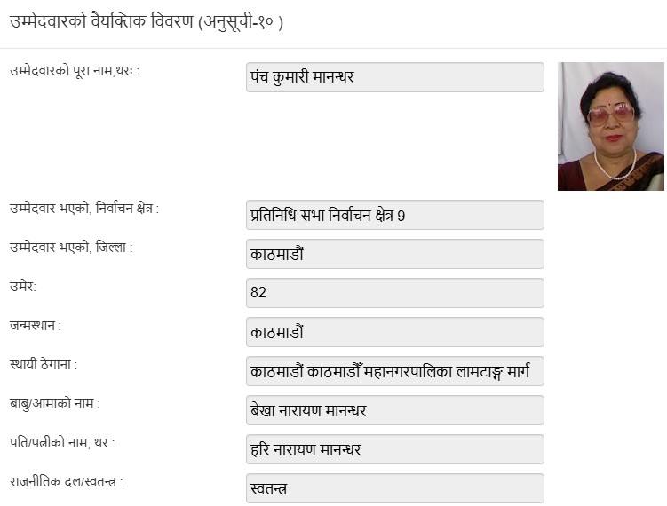 स्वतन्त्र उम्मेदवारहरूमा पनि पाका उमेरका आकांक्षी देखिन्छन्। ८२ वर्षीया पञ्चकुमारी मानन्धर काठमाडौं–९ बाट स्वतन्त्र उम्मेदवार बनेकी छन् भने ८१ वर्षीय प्रेमबहादुर राना मगर महोत्तरी–१ बाट स्वतन्त्र रूपमा प्रतिस्पर्धामा छन्। ८१ वर्षीय जयनारायण काफ्ले रुपन्देही–५ बाट र ८० वर्षीय शेरबहादुर खत्री ओखलढुङ्गा–१ बाट चुनावी मैदानमा छन्।