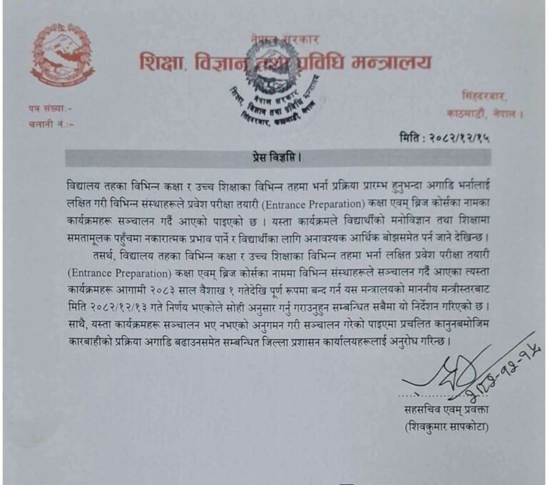 काठमाडौं – शिक्षा, विज्ञान तथा प्रविधि मन्त्रालयले विद्यालय तथा उच्च शिक्षामा भर्ना प्रक्रिया सुरु हुनुअघि सञ्चालन हुँदै आएका ब्रिज कोर्स र इन्ट्रान्स तयारी कक्षाहरू पूर्ण रूपमा बन्द गर्ने निर्णय गरेको छ।