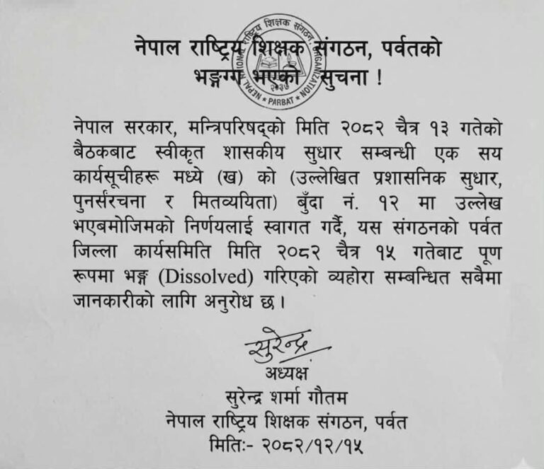 पर्वत – नेपाल राष्ट्रिय शिक्षक संगठनको पर्वत जिल्ला कार्यसमिति भंग गरिएको छ।