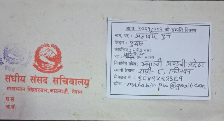 काठमाडौं- स्वतन्त्र सांसद महावीर पुनले आफ्नो सम्पत्ति विवरण सार्वजनिक गरेका छन् ।