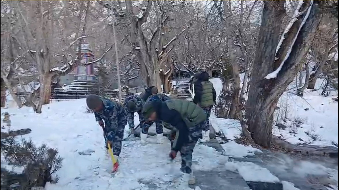 सशस्त्र प्रहरीद्वारा मुक्तिनाथ मन्दिरको हिउँ पन्छायो
