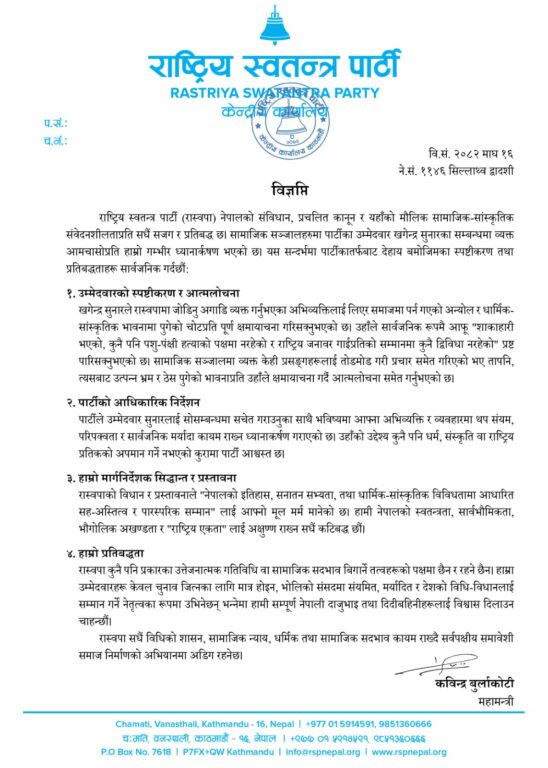 रास्वपाले शुक्रबार जारी गरेको विज्ञप्तिमा संविधान, प्रचलित कानून तथा नेपालको मौलिक सामाजिक–सांस्कृतिक संवेदनशीलताप्रति पार्टी सधैं सजग र प्रतिबद्ध रहेको उल्लेख गरेको छ।