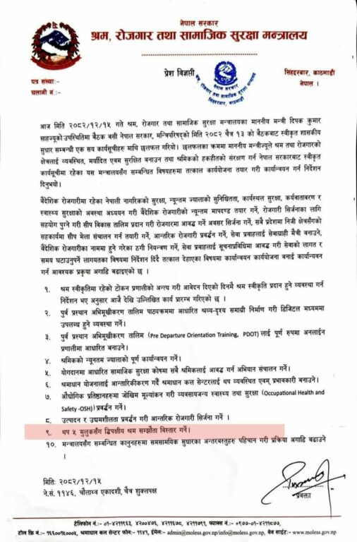 अर्कातिर थप पाँच देशसँग द्विपक्षीय श्रम सम्झौता विस्तार गर्ने निर्णय पनि श्रम, रोजगार तथा सामाजिक सुरक्षामन्त्री दीपककुमार साहले गरेका छन् । श्रमसम्बन्धी कानुनमा समसामयिक सुधार गर्ने प्रक्रिया पनि अघि बढाइने उनले बताएका छन् ।