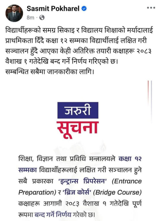 शिक्षा, विज्ञान तथा प्रविधि मन्त्री सस्मित पोखरेलसमेतले विभिन्न तहका इन्ट्रान्स र ब्रिजकोर्स बन्द गर्ने निर्णयसम्बन्धी पत्र सार्वजनिक गरेका थिए । पोखरेलले सामाजिक सञ्जालमार्फत् उक्त निर्णय सार्वजनिक गरेका थिए । उता शिक्षा मन्त्रालयको वेबसाइटमा पनि पत्र राखिएको थियो । उक्त सूचना प्रकाशित भएपछि एकाएक भाइरल भएको थियो ।