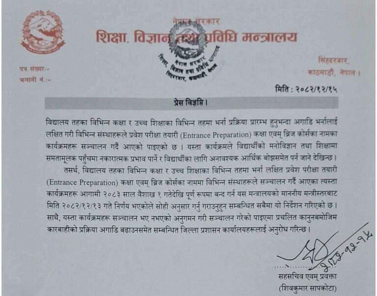 काठमाडौं– बालेन्द्र शाह नेतृत्वको संघीय सरकारले प्रवेश परीक्षा तयारी कक्षा (इन्ट्रान्स) र ब्रिजकोर्स बन्द गर्ने निर्णयको चर्को आलोचना भएको छ। त्यहीकारण शिक्षा मन्त्रालयले आफ्नो वेबसाइटबाट उक्त निर्णयसम्बन्धी पत्र नै हटाएको छ।