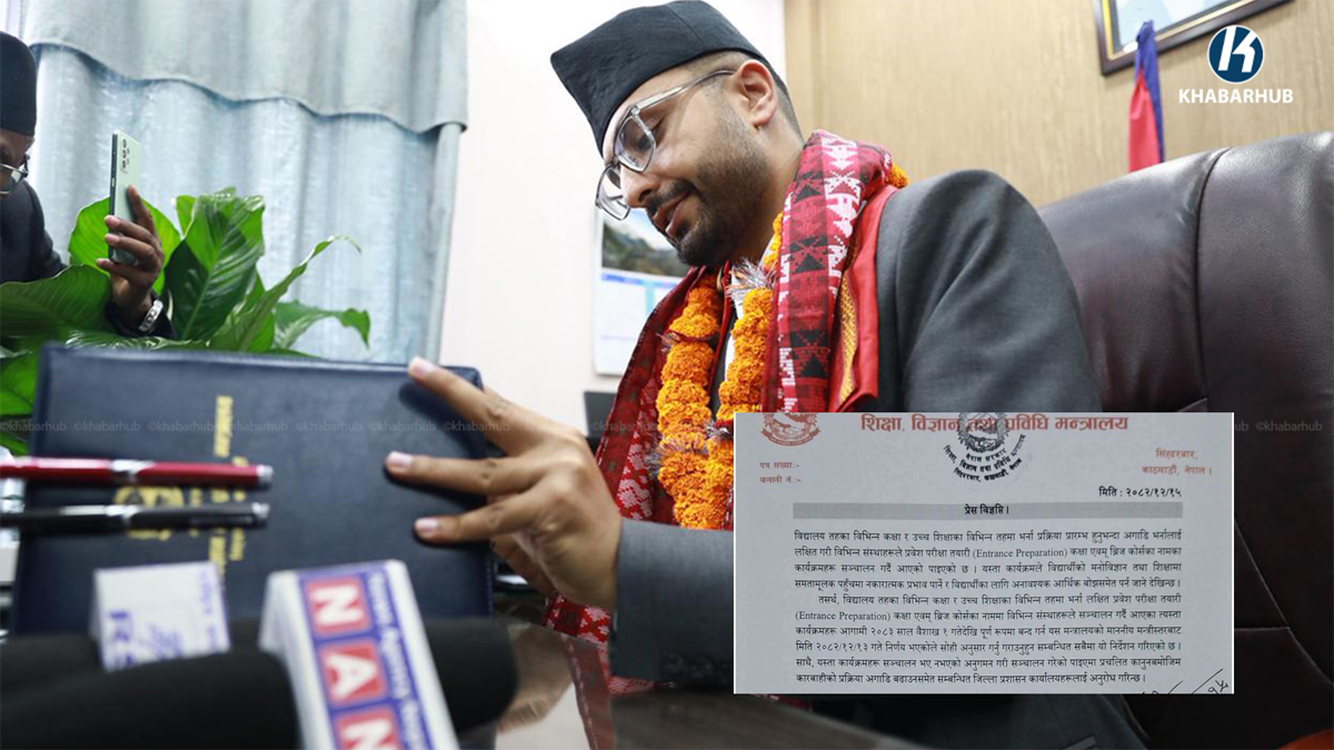 ‘विद्यालय तहका विभिन्न कक्षा र उच्च शिक्षाका तहमा भर्ना प्रक्रिया सुरू हुनुअघि विद्यार्थीलाई लक्षित गरी विभिन्न संस्थाहरूले सञ्चालन गर्दै आएका प्रवेश परीक्षा तयारी कक्षा र ब्रिजकोर्सले विद्यार्थीको मनोविज्ञान र शिक्षामा असमान पहुँच सिर्जना गर्ने र अनावश्यक आर्थिक बोझ थप्ने देखिएको छ’, उनले वक्तव्यमा भनेका थिए ।
