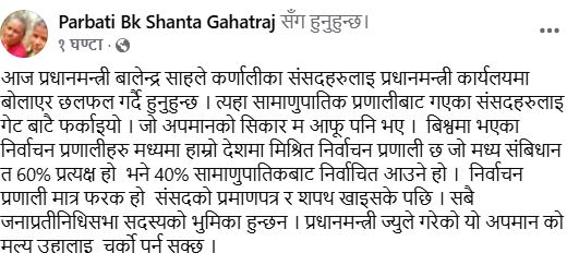 ‘आज प्रधानमन्त्री बालेन्द्र साहले कर्णालीका संसदहरुलाइ प्रधानमन्त्री कार्यलयमा बोलाएर छलफल गर्दै हुनुहुन्छ । त्यहाँ सामाणुपातिक प्रणालीबाट गएका संसदहरुलाई गेटबाटै फर्काइयो । जो अपमानको सिकार म आफू पनि भएँ ।’ उनले सामाजिक सञ्जाल फेसबुकमा लेखेकी छिन्, ‘विश्वमा भएका निर्वाचन प्रणालीहरु मध्यमा हाम्रो देशमा मिश्रित निर्वाचन प्रणाली छ, जो मध्य संविधानतः ६० प्रतिशत प्रत्यक्ष हो भने ४० प्रतिशत सामानुपातिकबाट निर्वाचित आउने हो । निर्वाचन प्रणाली मात्र फरक हो संसदको प्रमाणपत्र र शपथ खाइसके पछि । सबै जनाप्रतिनिधिसभा सदस्यको भूमिका हुन्छन् । प्रधानमन्त्रीज्यूले गरेको यो अपमान को मूल्य उहाँलाइ चर्को पर्न सक्छ ।’