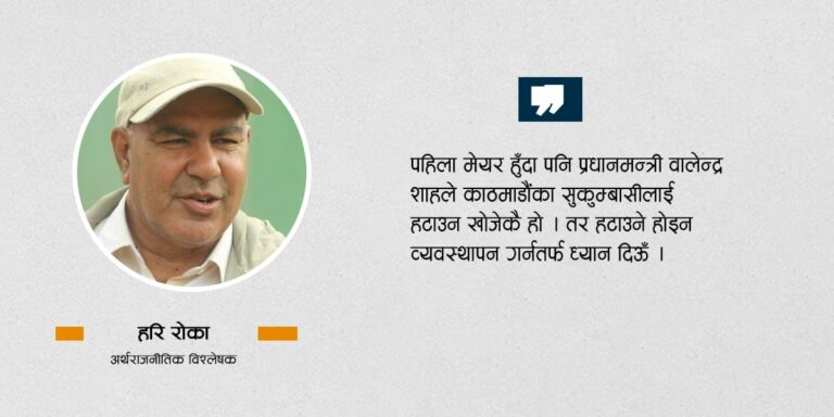 काठमाडौं- प्रधानमन्त्री वालेन्द्र शाहले काठमाडौंका सुकुम्बासीलाई हटाउने अभियान थालेपछि चौतर्फी चर्चा, प्रसंशा र आलोचना भइरहेको
