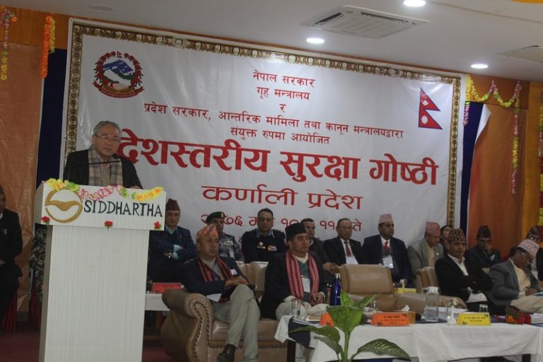 सुर्खेत– गृहमन्त्री राम बहादुर थापाको प्रमुख आतिथ्यमा सुर्खेतको विरेन्द्रनगरमा आयोजित कार्यक्रमबीच कर्णाली प्रदेश स्तरीय सुरक्षा