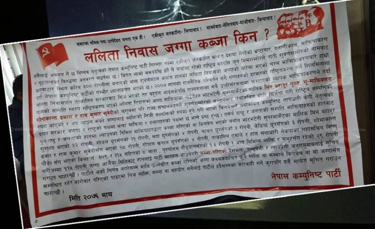 काठमाडौं- बालुवाटारस्थित ललितानिवासको जग्गा कब्जा गरेको विप्लप समूहले घोषणा गरेको छ । प्रतिबन्धित विप्लव समूहले