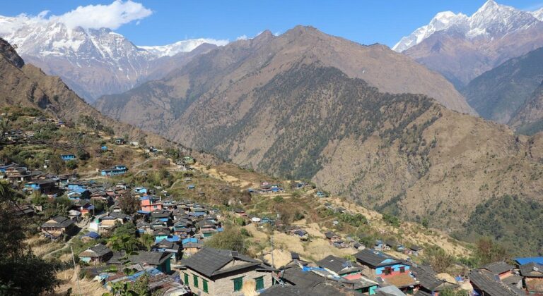 म्याग्दी– पृष्ठभूमिमा गुर्जा र धवलागिरि हिमाल । भिरालो पाखामा गुजमुज्ज ढुङ्गे घरहरू । ग्रामीण जीवनशैली
