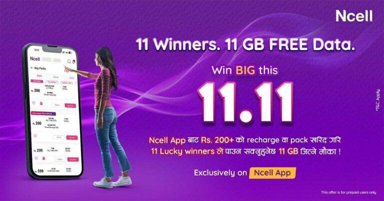 काठमाडौं– एनसेलले आकर्षक ‘११:११ एनसेल एप क्याम्पेन’ संचालनमा ल्याएको जनाएको छ । जसअन्तर्गत मंगलबार एनसेल एपमार्फत