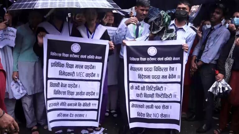काठमाडौँ- चिकित्सा शिक्षा ऐन परिमार्जन गर्नुपर्ने माग गर्दै स्वास्थ्यकर्मीहरुले काठमाडौंमा प्रदर्शन गरेका छन् । वर्तमान चिकित्सा