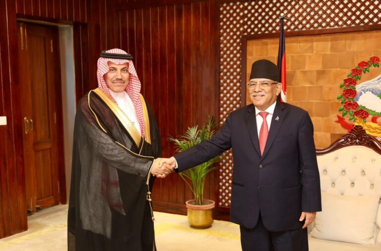काठमाडौँ- प्रधानमन्त्री पुष्पकमल दाहाल ‘प्रचण्ड’ सँग नेपालका लागि साउदी अरबका राजदूत साद अबुहमिदले शिष्टाचार भेटवार्ता