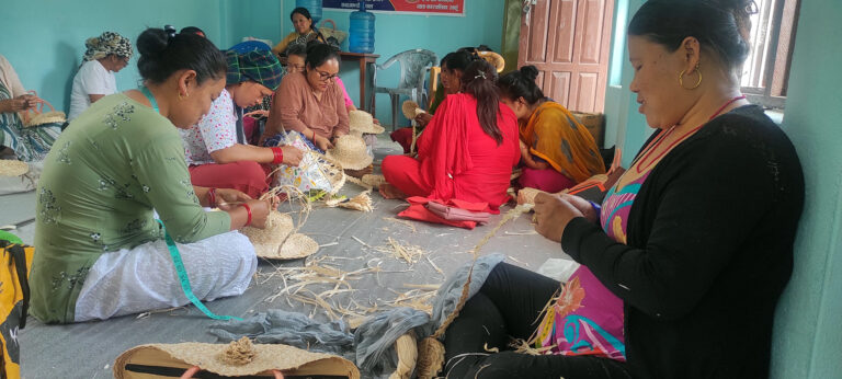 डुम्रे– तनहुँको व्यास नगरपालिका–५ की प्रतिमा श्रेष्ठ मकैको खोस्टाबाट टोपी र झोला बनाउन व्यस्त छिन्।