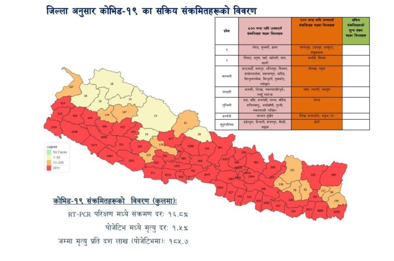 काठमाडौँ- नेपालका ५७ जिल्लामा कोरोना भाइरस संक्रमणको दर तीव्र देखिएको छ । स्वास्थ्य तथा जनसंख्या