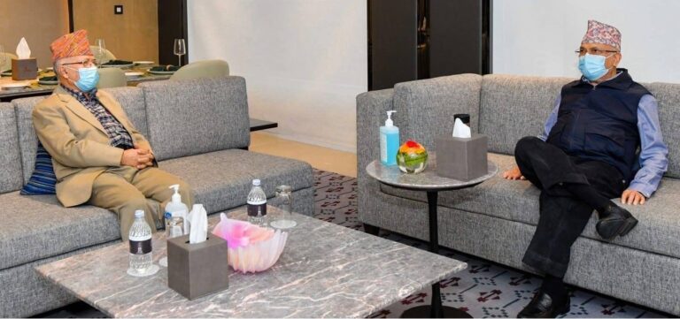 काठमाडौँ– सत्तारुढ नेकपा एमालेका अध्यक्ष केपी शर्मा ओली र वरिष्ठ नेता माधवकुमार नेपालबीचको भेट सकिएको